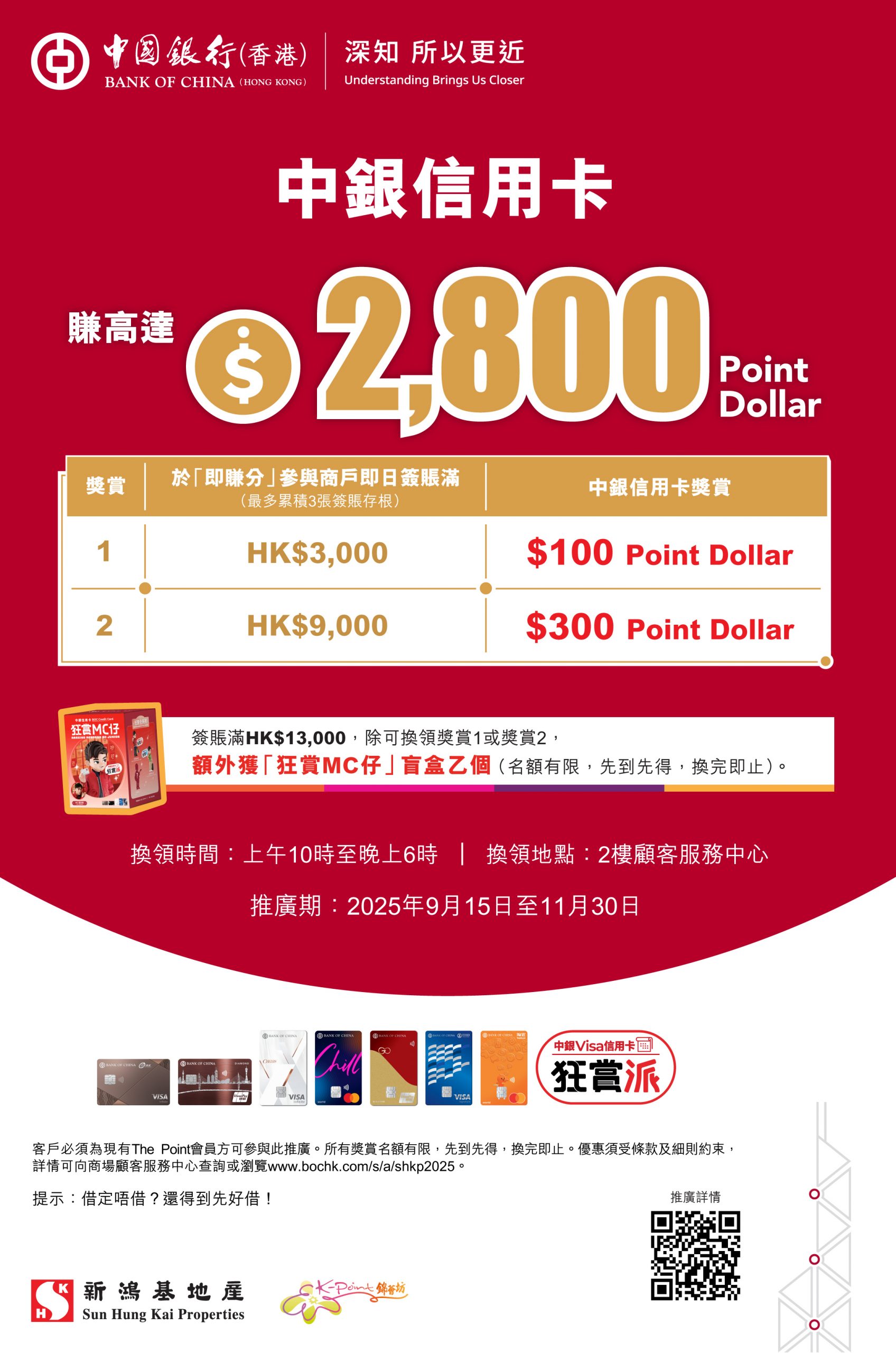 中銀信用卡 ● 賺高達$2,800 Point Dollar